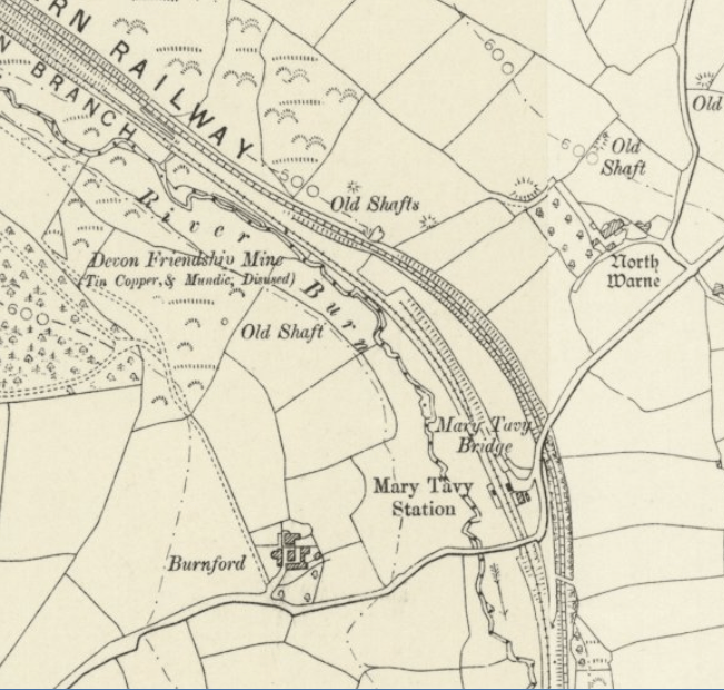 The extract below shows the zoomed in view of Mary Tavy Station which is around a mile to the south west of the village which sits on the edge of the moor. The track formation and bridge over the GWR branch line is still in situ today but the LSWR line is a lot harder to see. The station is no longer visible but the houses, show as the hatched buildings are still in place. The station is shown with single line and one siding.